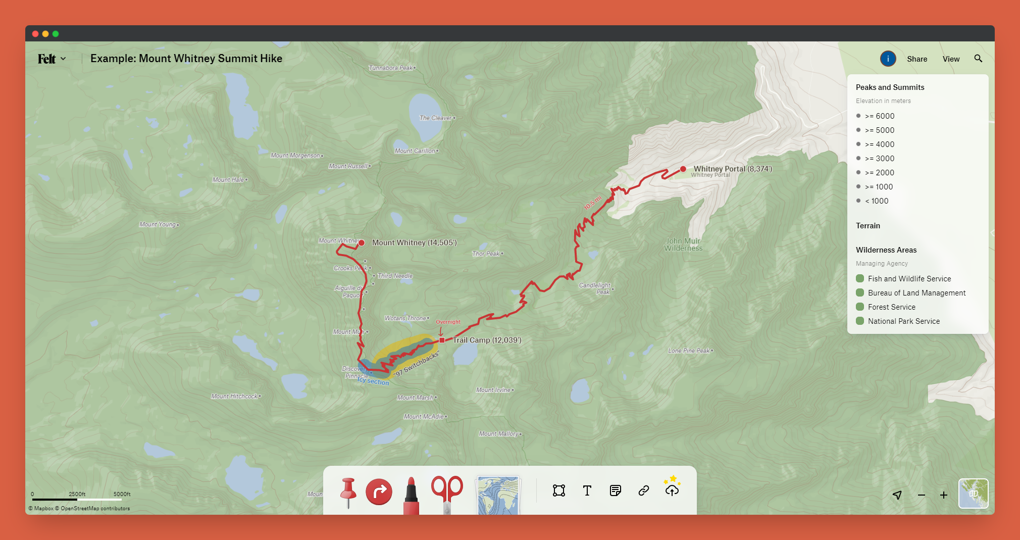 There are so many incredible use cases for this application. The collaborative nature of Felt makes it one of the best tools I've seen for planning trips with groups. You can import points of interest, make notes about locations, load in basemaps, and measure routes. The possibilities are really incredible with a tool like this, take a look at this great example of an Appalachian Trail hike planned with Felt.