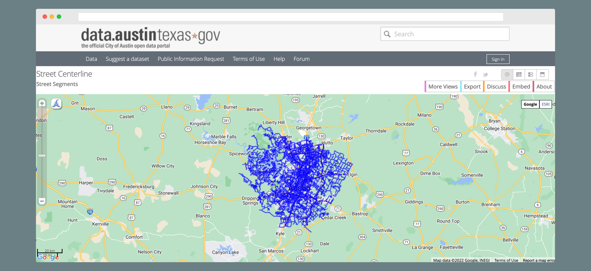 First, I downloaded street centerline data from Austin Open Data, the same data source I used for my other open data project.