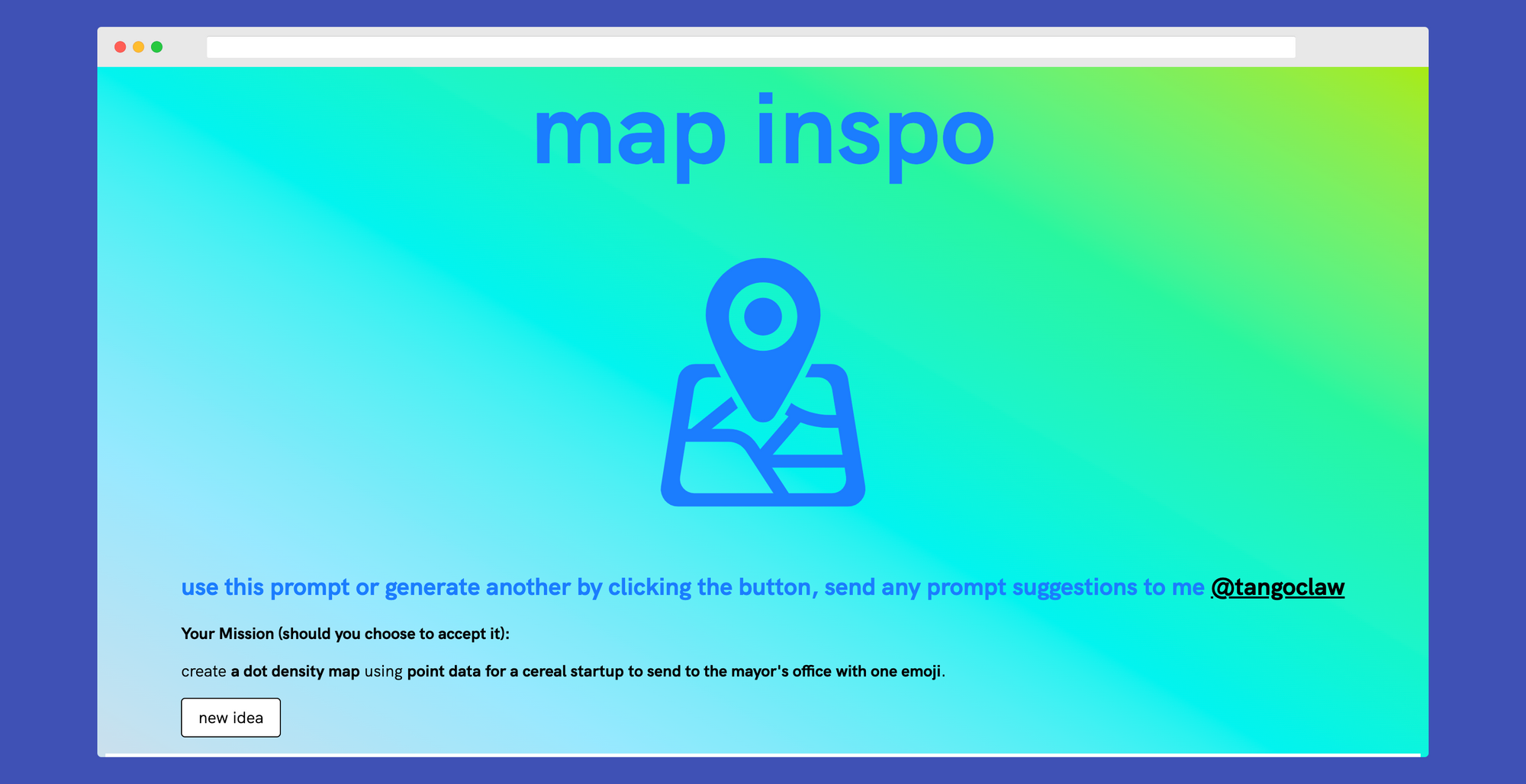 In keeping with our theme of 30 maps in 30 days, I created this simple map inspiration generator using glitch. If you want to exercise your creativity, give it a shot!