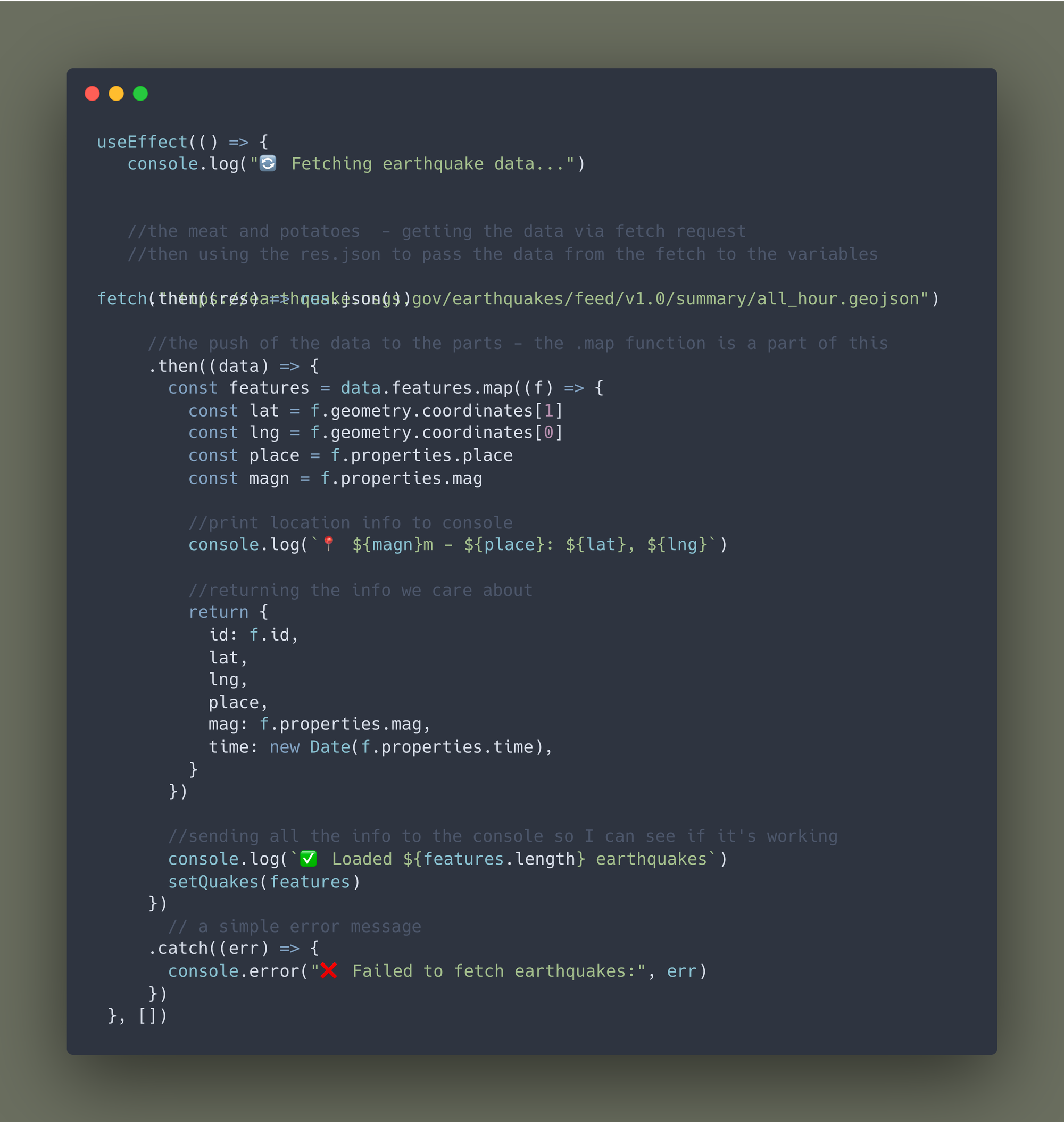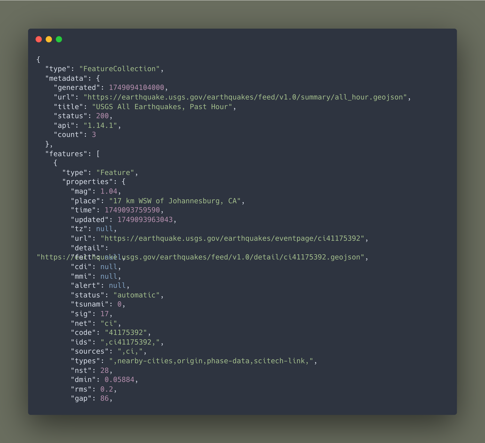 Grab the latest earthquake data using a sleek call to an existing service (no need to reinvent the wheel here). USGS provides GeoJSON data on seismic activity updated by the minute.