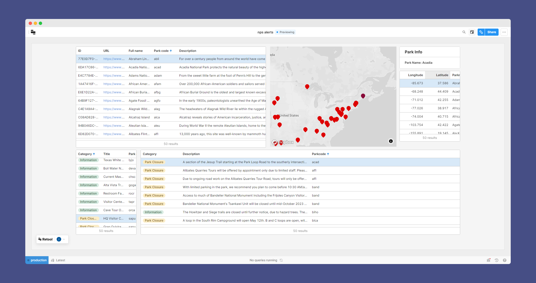 A dashboard is the place where your data can live and breathe in real time. For Example, using the NPS api and Retool.com I was able to create this dashboard for National Park alerts. Now, each time I visit my dashboard, I can know where and what parks have alerts, and know what the information behind the alerts are, all in real time and shown on a map.